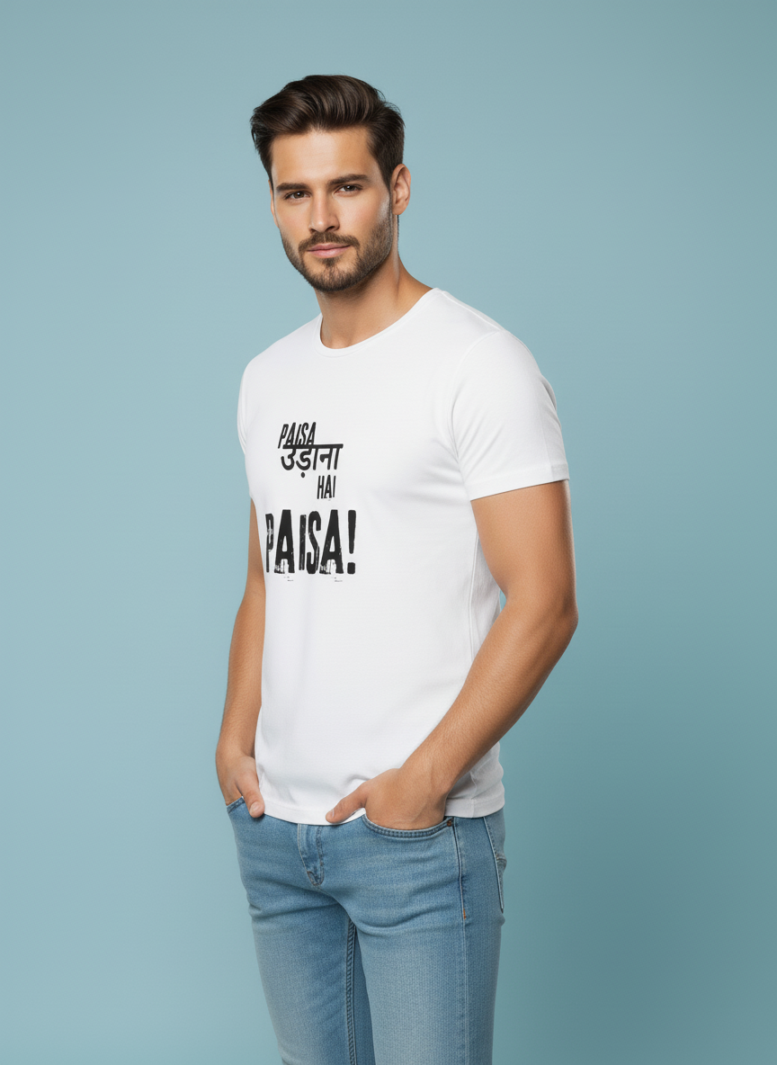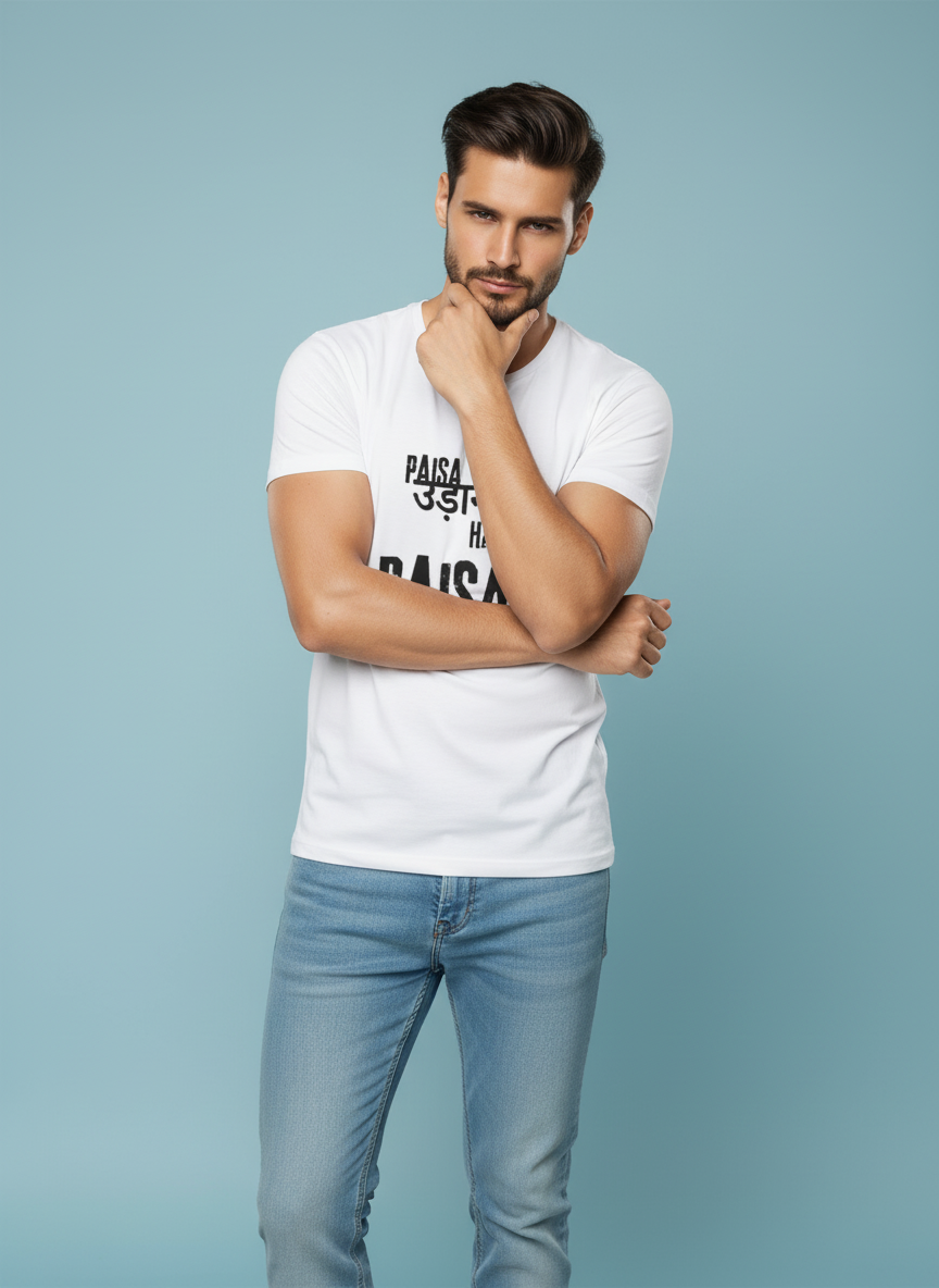 Introducing our exclusive *Paisa udana hai Paisa* Regular Fit T-Shirt, a must-have addition to your wardrobe that perfectly blends style, comfort, and bold statements! ๐